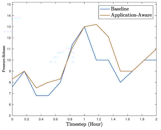 Figure 7 shows the pressure-release comparison between the two cases during the 2-h interval. Each tick in the figure aggregates the results from 12 min (i.e., 72 timesteps). Based on the results, the application-aware detector performs better than the baseline detector in most cases. The baseline detector performs only slight better in the aggregated timestep at , which could be due to detection errors by the application-aware detector. However, in the rest of the 2-h period, the proposed detector perform significantly better.