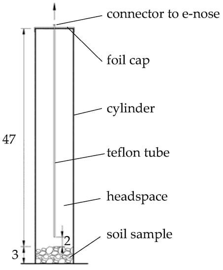 The soils were stored for around a year in air-dried conditions before being gently crushed in a mortar and put through a 2-mm sieve. The soil samples (75 g) were moistened with 15 mL of water, placed in 2.5-dm3 glass cylinders that were carefully washed and dried at 200 °C, and covered with a sterile aluminum foil with a 3-mm hole (diameter) in its center. This meant that the soil could be slowly dried and most of the soil emissions could be maintained in the cylinder headspace (Figure 1).