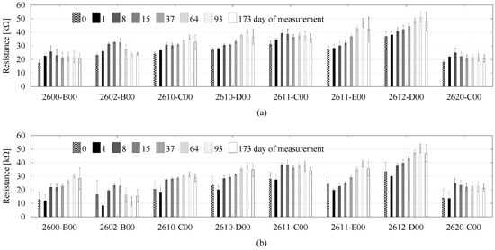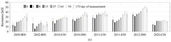 The average value of resistance (kΩ) from the last 45 s of measurements for particular gas sensors are presented in Figure 2. Generally, the value of signal in the electrical circuit of these sensors is inversely proportional to the concentration of volatile compounds and pollutants. It is noticeable that, during conducted measurements, it shifted constantly for the non-modified samples. The soil samples were slowly dried out naturally since the beginning of the measurements. According to Lavanya et al. [32], the moist soil samples are characterized by a more intensive smell profile than the dry samples. After spitting fuel into the soil samples, the concentration of pollutant fumes in the gaseous phase increased, which was found during the subsequent measurement session. The return of signal responses to the incipient values was observed in the second day after contamination for the following gas sensors: 2600-B00, 2610-D00, 2611-C00, and 2620-C00. For the other sensors, this fact was observed on the 15th day (2612-D00), 37th day (2602-B00), and 64th day (2611-E00). Alignment of the sensor response to the incipient value does not unequivocally mean that all doses of fuel were already evaporated. The fingerprint differences between the blank and contaminated soil samples were still noticeable.