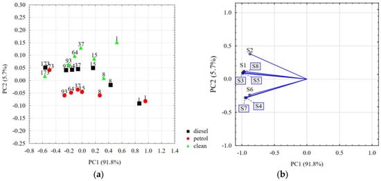 Results of the PCA analysis pertaining to the volatile fingerprints of the soils under examination are presented in Figure 3a. Using PCA, we reduced the eight-dimensional data space (eight e-nose sensors) to a two-dimensional data covariance matrix, with the x-axis representing 91.8% and the y-axis 5.7% of the whole covariance. This method only lost 2.5% of the information, which is a very good level. This is a certain degree of simplification; however, it enables presenting the results using standard two-dimensional charts. The results of variable loadings (particular sensors) are presented in Figure 3b. The responses of all sensors were similar in direction. All sensors were closely related to the first principal component.