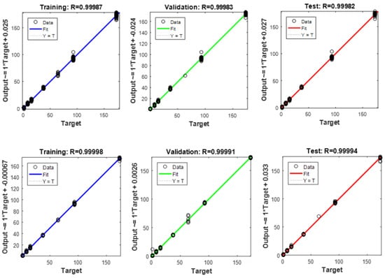 The learning (70%), testing (15%), and validation (15%) data subsets were chosen randomly from the entire dataset. The training data were presented to the networks during training, and the networks were adjusted according to their error. Validation was used to measure network generalization and to finish training when generalization stopped improving. Testing the data had no effect on training, and thus, provided an independent measure of network performance during and after training.