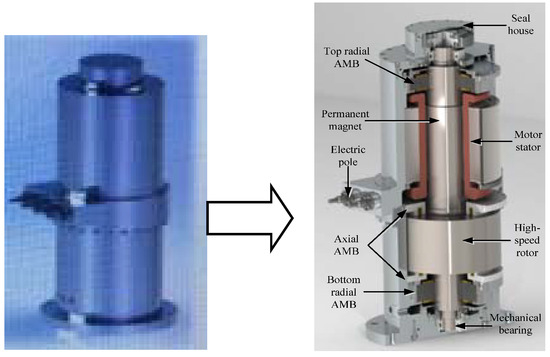 As shown in Figure 1, the MEFESS is composed of the seal house, PMSM, AMB, electric pole mechanical bearing, etc. The PMSM is the crucial component for energy transmission in the form of electric and kinetic, which is divided into a motor stator and coaxial permanent magnet. The AMB possesses a 5-degree freedom in the axial and radial directions, which is able to maintain the high-speed rotor suspending in the vacuum body. The high-speed rotor is used as the kinetic energy storage component, and the mechanical bearing provides the strength protection once the AMB is running out. Outside of them, the seal house is reinforced to fix all of the components and thus provides a vacuum.