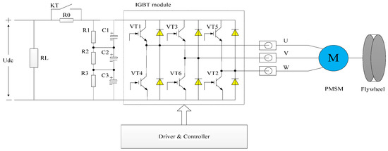 Considering the problem of rotor strength during high-speed rotation, the PMSM adopts a mechanism of a surface-mounted permanent magnet with a high-intensity sheath to fasten it. The minimum power scheme of the PMSM driver is shown in Figure 2. The six insulated gate bipolar transistors (IGBTs) VT1~VT6 are used as the power switches of the rectifier and inverter. The resistor R0 and relay KT compose the power soft-start module, while the resistors R1~R3 and capacitors C1~C3 are able to stabilize the DC-bus voltage Udc. The resistor RL is traded as the simulate load. In the three-phase interface of the motor electric pole, three current sensors U/V/W are connected to measure the stator current.