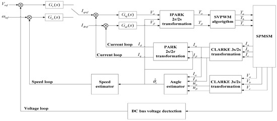 Generally, the PID-based vector control strategy was adopted for the SPMSM system, including speed loop during charging (voltage loop during discharging), double current loop and position loop, as shown in Figure 3. , , and are voltage, speed and current reference inputs, respectively. , , and are PID controllers.