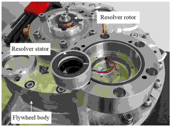 For the MSFESS, the flywheel can be accelerated to a high speed when the magnetically suspended system can function properly since the flywheel axis will strike the bearing without suspension. However, when the motor is controlled in a low speed, it can also be safe even if the AMB system is powered off and in that case, the flywheel rotor will stay connected with the bearing body. For this working condition, a kind of position sensor can be installed at the terminal of the rotor axis and applied as the angle benchmark to evaluate the observer estimation result. Figure 6 shows the real picture of the resolver, consisting of a stator and rotor, while the rotor is fixed at the terminal of the axis and the stator is connected to the flywheel body. However, if the flywheel axis is suspended by the AMB system, the clearance between the stator and rotor will exceed the maximum tolerance value of the resolver, and in this case, the resolver cannot be used any more.