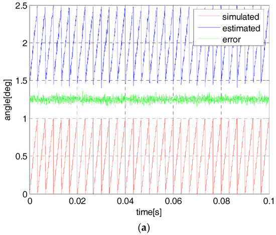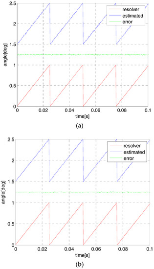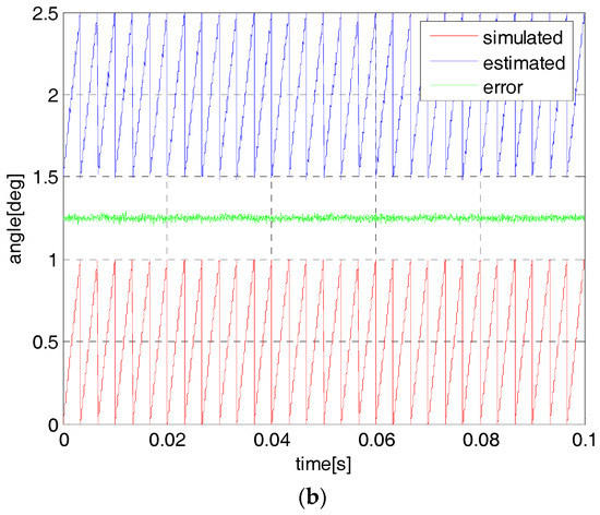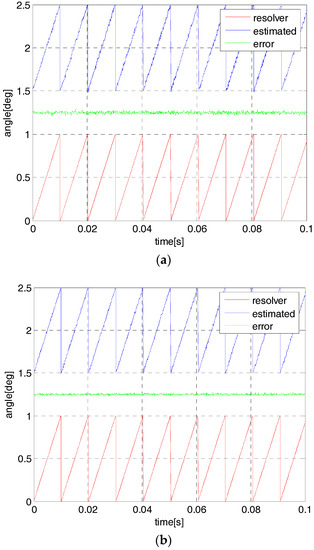 The simulated angle and its estimation at 9000 rpm by using one-step observer (a) and two-step observer (b).