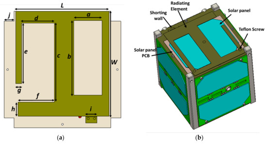 Remote sensing is the technology of achieving information regarding climate change by a sensing device mounted on aircraft or spacecraft platform [1]. Nanosatellite technology can facilitate remote sensing applications including greenhouse gas monitoring, maritime tracking and messaging, multispectral Earth imaging etc. for academic, government, and commercial organizations [2]. Nanosatellites experience “smaller, cheaper, faster, better space missions” and introduce a revolutionary concept to remote sensing space research [3]. This concept has led to enthusiastic scientific, private, and government missions because of the use of low-cost miniature electronics with low power consumption [3,4]. Over the last few years, the number of nanosatellite missions has increased dramatically for low-earth orbit missions. Recently, nanosatellites have attracted attention for NASA space exploration missions beyond Earth’s orbit [5]. Every nanosatellite has some common functions for satellite operations, such as altitude control and determination, a power system, and uplink-downlink communications. Solar panels are used to manage the required power, and antennas are used to establish uplink-downlink communications. The ultra-high frequency (UHF)-band, especially the frequency range 420–450 MHz, is highly desirable for nanosatellite researchers, because the International Telecommunication Union has allocated this band as the International amateur satellite frequency band [6]. Antenna design for nanosatellites especially for lower frequencies presents its own challenge and has been a critical matter for CubeSat researchers [7]. In addition, solar panel integration presents another major problem because of the limited surface of the nanosatellite body [8]. These limitations were overcome by using deployable solar panels and antennas in recent nanosatellite missions [9]. However, mechanical deployment is quite sophisticated and this might increase the chance of mission failure [10]. Several small satellite missions have failed as a result of antenna deployment complexity [11,12] and solar panel deployment complexity [13]. In contrast to the deployable antenna, the patch antenna is an effective replacement to improve mission reliability. However, a UHF patch antenna occupies a large area of the nanosatellite body surface and introduces complexity in terms of integrating sufficient solar cells.