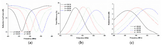 Parametric study on slot length a; (a) reflection coefficient, (b) total efficiency and, (c) realized gain: decreasing the slot length causes the resonant frequency to shift upwards.