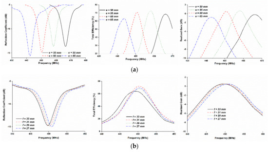 (a) Parametric study on the length of e and (b) parametric study on the length of the f: the radiating element e has a strong influence on the resonant frequency rather than f.