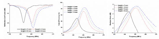 The effect of antenna performance on the gap between the radiating element and ground plane was investigated and is plotted in Figure 4. The resonating frequency remained almost unchanged as the gap height increased, but the gain and total efficiency increased. Despite the relation between the gap and antenna radiation performance, the gap between the radiating element and ground plane could not be increased randomly because of the constraint introduced by the satellite structure. On the other hand, when the gap was decreased to below 4 mm, the resonant frequency was shifted as well, thereby decreasing the gain and efficiency. This occurs because of the close interaction of the antenna radiator with the lossy solar panel [8]. Based on the aforementioned parametric study, the optimized antenna design parameters were arranged to achieve proper impedance matching, as tabulated in Table 1.
