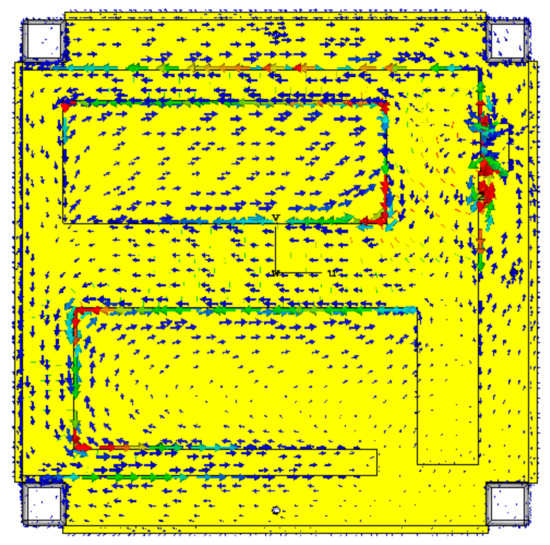 The surface current distribution of the modified PIFA is depicted in Figure 5. The majority current was observed in the vicinity of the shorting wall and some strong current arose at the slot corner. This indicates the formation of a larger electrical patch to achieve lower frequency, even though more than 55% of the radiating element was truncated. Moreover, the current flow was distributed across the structure as well as the ground plane, which reduced interference with external objects that affected antenna performance.