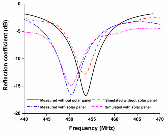 Simulated and measured reflection coefficient of the proposed antenna. Reflection coefficients are measured with and without the solar panel and the measured −10 dB operating bandwidth is 447.5 MHz–453.5 MHz.