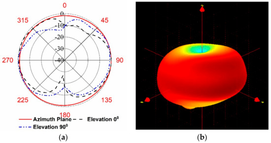 Measured radiation pattern at 450 MHz (a) azimuth and elevation (b) 3D pattern showing omnidirectional radiation characteristics.