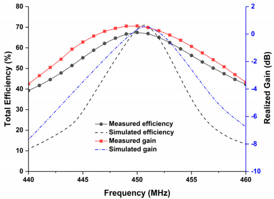 Simulated and measured total efficiency and gain of the fabricated prototype; where 67.45% efficiency is achieved with 0.6 dB of realized gain.