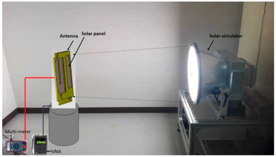 Solar panel output power measurement setup. The components are: Solar-simulator, vector network analyzer (VNA), Multi-meter and the proposed Antenna. The output power measurement was conducted using a fixed load.