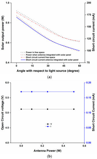 (a) Solar output power and short circuit current measurement without and with antenna placement; (b) Solar characterization with varying antenna power from 0.1 W to 0.5 W.