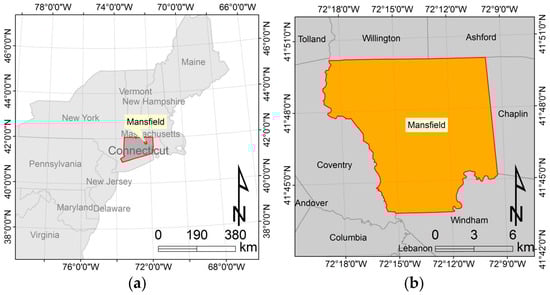 The town of Mansfield (CT, USA) was selected as the study area (Figure 1). Mansfield is a town in Tolland County, located in the Eastern Connecticut, with an area of 118.3 square kilometres based on the 2017 U.S. Census Bureau Topologically Integrated Geographic Encoding and Referencing products. In 2010, Mansfield’s population was 26,543 according to the 2010 U.S. decennial census.