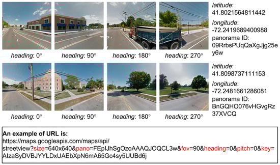 Two sets of GSV images, four per set, were obtained for a view point panorama ID (09RrbsPUqQaXgJjg25ey6w) and a viewpoint point panorama ID (BnGQHO076vHGvgRz37XVCQ) and an example of URL with the parameters highlighted in red color.