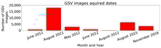 GSV images can detect the orientation of detected UPCs in 360° GSV, similar as the bearing-only sensor, which is commonly used to measure the direction toward features from a robot. Static street view images were downloaded through the GSV image application programming interface (API) by providing uniform resource locators (URL) that embed the appropriate parameter information []. The GSV API automatically snaps the requested coordinates to the nearest available GSV viewpoint []. In order to acquire accurate latitude and longitude values for each viewpoint of GSV, the “streetview” Python package (https://github.com/robolyst/streetview) was used to convert the requested coordinates into the nearest available GSV coordinates via a list of panorama IDs (i.e., unique identification for each GSV panorama view with acquired date [year, month], latitude, and longitude). The most recent panorama ID was then used as location parameter input. Other required parameters for the URL include size (output size of GSV image), heading (cardinal direction in the range of 360°), fov (horizontal field-of-view angle), pitch (the up or down angle), and API key []. Four GSV images were obtained for each view point with a fov of 90° and headings of 0°, 90°, 180°, and 270°, respectively (Figure 2). We developed a Python script to automatically create the URLs and download the 37,160 GSV images needed to cover the study area. The GSV images were acquired between 2011 and 2016 (Figure 3); this range is due to the varying frequencies with which Google updates street view imagery. We cropped the downloaded images to eliminate the Google logos.