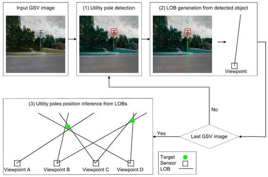 The outputs of UPCs detection in GSV images using DL are bounding boxes of detected UPCs, which result from implementation of odometry from monocular vision of GSV images as shown in Figure 6. Therefore, estimating locations of UPCs in pure GSV images is a multiple-source localization problem from passive angle measurements, which has been widely investigated [,]. The LOB-based approach is one of three main multiple-source localization approaches []. An LOB measurement was applied to estimate the location of a target (i.e., UPC) because detected UPCs are not signal sources such as propagating signal sources whose signal strength can be measured (Figure 6). An LOB measurement does not require as many strict conditions as other methods (e.g., synchronization and power transit) do.