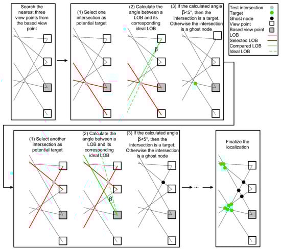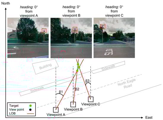 In LOB localization, azimuths from viewpoints of multiple images to a given UPC allow the UPC location to be triangulated (see Figure 6). Ideally, intersection of multiple LOBs is the exact location of the target because the LOBs pass through the target (see Figure 6). However, numerous ghost nodes (i.e., false targets) occur when the LOB measurement is used in a dense emitter environment, as shown in our study for estimating locations of UPCs in GSV images [] (see Figure 7). As a result, a modified brute-force-based three-station cross location algorithm was utilized to minimize the ghost node problem of multiple-source localization using LOB measurement (Figure 4: source localization from viewpoints A, B, and C), based on two assumptions that targets and sensors are on the xy plane, and all LOB measurements have the same precision []. More specifically, the LOB measurement method uses the following steps (Figure 7): (1) for a given viewpoint, find the closest neighboring viewpoints; we tested the performance of the algorithm using 2 to 8 of the closest neighboring viewpoints (i.e., the corresponding number of views is 3 to 9); (2) measure the angles between each pair of LOBs from all viewpoints []; (3) check if there are positive associations among LOBs (set as 50 m length) from current viewpoint and its nearest viewpoints []; (4) repeat the process from step (1) to step (3) for every intersection point. To be more specific, three positive detections from any three views within an angle threshold (β) produce a positive association among LOBs []. Therefore, theoretically, given that detection rates are constant, the number of estimated UPCs increases as the number of views increases based on the probability of combination. For example, assuming the number of all possibilities of UPC estimation is and the detection rate is constant; then the probability of positive association with 7 views (i.e., ) is greater than the probability of positive association with 4 views (i.e., ).