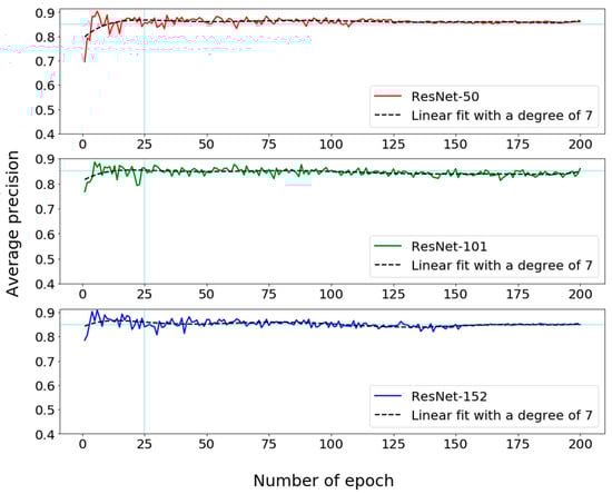 For testing the performance of using deep learning to estimate the locations of UPCs in GSV images, we conducted experiments on a customized server, which is equipped with an Intel i5 CPU, 16 GB RAM, a GeForce GTX 970 graphic card, and a GeForce GTX 1080ti graphic card. To obtain an optimal parameter setting, we trained and validated the RetinaNet object detector with 50-layer, 101-layer, and 152-layer ResNets (denoted as RetinaNet-50, RetinaNet-101, and RetinaNet-152, respectively) using the same labeled samples. For each of the three trained detectors (or detector-training choices), a step of 2500, a batch size of 1, and an epoch number of 200 were selected for the learning process. In the training step of DL, the step size was decided based on the sizes of batch and training dataset. During training, random horizontal flips augmentation along the X direction (with a chance of 0.5) was used to introduce variation in the training data. In order to avoid overfitting, a validation dataset was used to evaluate the accuracy of the RetinaNet object detector with three training choices at the end of each epoch. The strategies for reducing overfitting were suspended during the validation process. Figure 9 shows that the average precision (AP) reached the peak value around the 25th epoch and the model tended to be convergent. Thus, the RetinaNet object detectors were trained for 25 epochs before applying to utility pole detection from GSV images for our study area (see Figure 9).