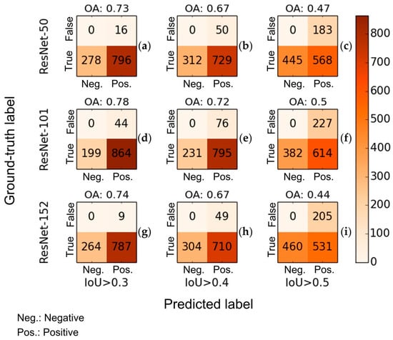 Confusion matrices for the RetinaNet object detector learning with 50-layer, 101-layer, and 152-layer ResNets after training 25 epochs on IoU with values greater than 0.3, 0.4, and 0.5 for choosing optimal parameters. (a) RetinaNet-50 with IoU > 0.3; (b) RetinaNet-50 with IoU > 0.4; (c) RetinaNet-50 with IoU > 0.5; (d) RetinaNet-101 with IoU > 0.3; (e) RetinaNet-101 with IoU > 0.4; (f) RetinaNet-101 with IoU > 0.5; (g) RetinaNet-152 with IoU > 0.3; (h) RetinaNet-152 with IoU > 0.4; (i) RetinaNet-152 with IoU > 0.5.