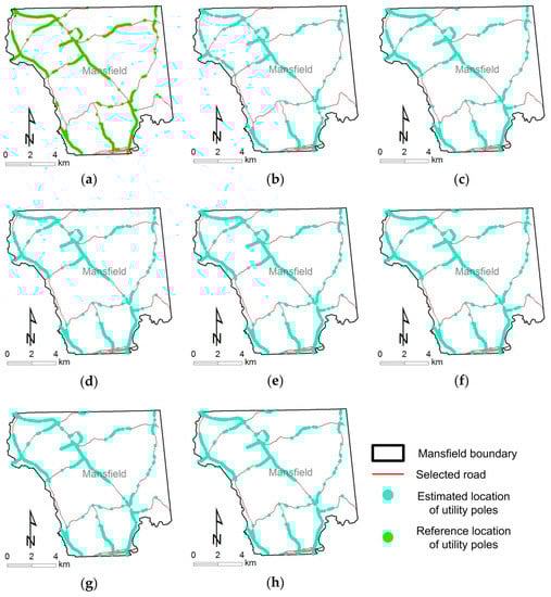 The distributions of reference utility poles with crossarms (UPCs) and estimated UPCs using different numbers of views, an angle threshold of 2°, and a distance threshold of 4 m in the study area. (a) Reference utility poles; (b) estimated UPCs using 3 views; (c) estimated UPCs using 4 views; (d) estimated UPCs using 5 views; (e) estimated UPCs using 6 views; (f) estimated UPCs using 7 views; (g) estimated UPCs using 8 views; (h) estimated UPCs using 9 views.