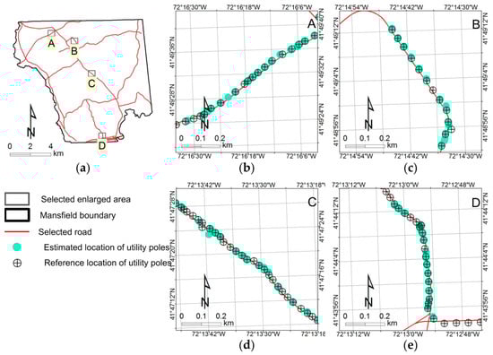 Enlarged examples of distribution patterns of reference and estimated utility poles with crossarms in the study area. (a) the locations of enlarged examples; (b) enlarged area A; (c) enlarged area B; (d) enlarged area C; (e) enlarged area D.