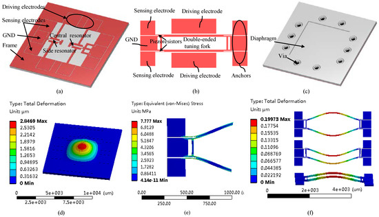 In addition, there are three vibration modes shown in Figure 1f, which are the first, second and third modes respectively. Among these three modes, the first two modes are in-plane modes with close frequencies and the third is the out-of-plane mode with a significantly higher frequency which is beyond the scope of this article. Each resonator is excited to vibrate in a lateral in-phase mode (the first mode), which can minimize the mechanical coupling between the resonators and the pressure sensitive membrane. The second in-phase mode can be avoided by adjusting the driving voltages. Furthermore, the vibrating directions of the resonators and the pressure sensitive membrane are perpendicular, which further reduces the energy coupling between them.