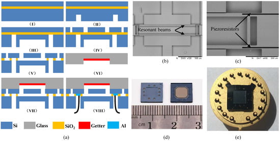The resonant pressure sensors were fabricated based on a 4-inch SOI wafer (a (100) n-type substrate layer of 300 µm, an oxide layer of 2 µm, a <110> p-type device layer of 40 µm with a conductivity of 0.01 S/m) by conventional microfabrications, which mainly include photolithography, deep reactive ion etching (DRIE), and silicon-glass anodic bonding (see Figure 2a). In the first step, the SOI wafer was thoroughly cleaned based on conventional procedures in the IC industry (see Figure 2(aI). Next, DRIE was used to form the pressure sensitive membrane and through-silicon vias (see Figure 2(aII,III). Then, DRIE was used to form the layer of the resonators, including the resonant beams, excitation electrodes and detection piezoresistors (see Figure 2(aIV), which were further released by removing the underneath oxide layer by gaseous hydrofluoric acid (HF) (see Figure 2(aV). In the next step, glass covers were formed by HF etching, deposited with getter materials (see Figure 2(aVI) and anodically bonded to the patterned SOI wafer to form a sealed vacuum chamber (see Figure 2(aVII). In the end, Al was sputtered on the backside to form electrical connections through vias with the surrounding world (see Figure 2(aVIII).