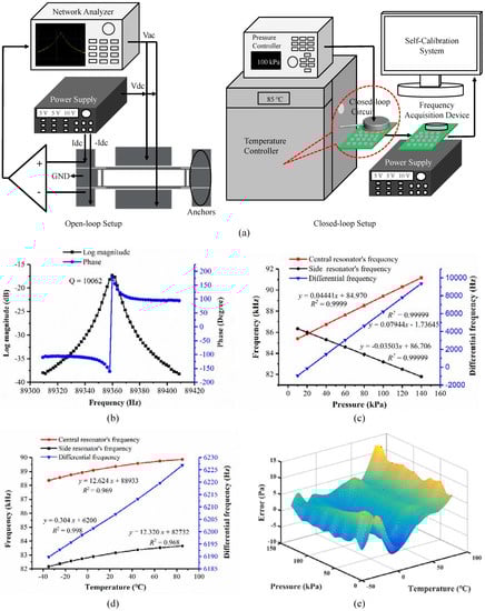 (a) Schematic of the experimental setup for both open-loop and closed-loop measurements of the proposed resonant pressure sensors. (b) Open-loop testing results where the quality factor and the phase of the developed resonant pressure microsensor were obtained. (c) Closed-loop testing results where the resonant frequency of the central resonator (f1) and side resonator (f2) and the differential output (f1–f2) of the developed resonant pressure microsensor versus applied pressure at 25 °C. (d) The shift of resonant frequencies as a function of temperature in the range of −35 °C to 85 °C under a predefined pressure of 100 kPa. (e) The errors of the developed resonant pressure microsensors in a pressure range of 10 kPa to 150 kPa and a temperature range of −35 °C to 85 °C. The quantified errors were within ±14 Pa, within 0.01% F.S.