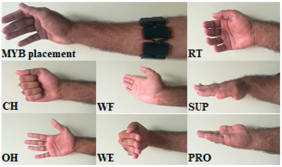 Position of the MYO armband (MYB) on the forearm and different types of motions considered in this work. RT: rest; CH: close hand; WF: wrist flexion; SUP: supination; OH: open hand; WE: wrist extension; and PRO: pronation.
