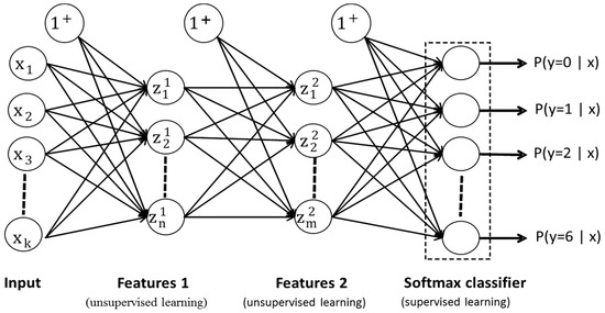 In this work, two-layer SSAE were used as previously described [46,69,70] and as shown in Figure 2. The network was trained with the scale conjugate gradient descent algorithm [71] using greedy layer-wise training [72]. The parameters were optimized as previously detailed [46], and the length of layers was adjusted for both SSAE-f and SSAE-r. For SSAE-f, the sizes of the first and the second layers were 32 (k = n) and 16 units, respectively, while for SSAE-r, they were 100 (k > n) and 50 units, respectively, such that any further increment in the sizes of layers (n, m) just increased the computational cost. The final parameters’ values for both layers were set as follows. L2 regularization (L2R) was set to 0.0001, sparsity regularization (SR) to 0.01, and sparsity proportion (SP) to 0.5.