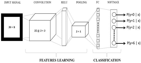 Block diagram of the convolutional neural network (CNN) used in this work. The input corresponds to a 150 ms (30 × 8 samples) window of eight channels. There were only single layers of convolution, Relu, pooling, and fully connected (FC) layers, while Softmax was used for classification.