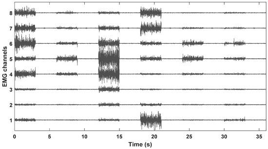 The data were recorded using the commercial MYO Armband (MYB). MYB are wearable EMG sensors that are developed by Thalamic Lab (Kitchener, ON, Canada, https://www.myo.com/) and have eight channels of dry electrodes with a sampling frequency of 200 Hz. It is a low-cost, consumer-grade device with a nine-axis inertial measurement unit (IMU) [26] that can communicate wirelessly with PCs via Bluetooth. It is a non-invasive, more user-friendly and time-saving device compared with conventional electrodes [49,50]. Notwithstanding the low sampling frequency, its performance has been shown to be similar to full-band EMG recordings using conventional electrodes [51,52], and the technology has been used in many studies [53,54,55,56,57,58,59,60,61,62,63,64]. Therefore, this study did not focus on the comparison with conventional EMG electrodes.