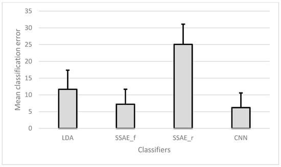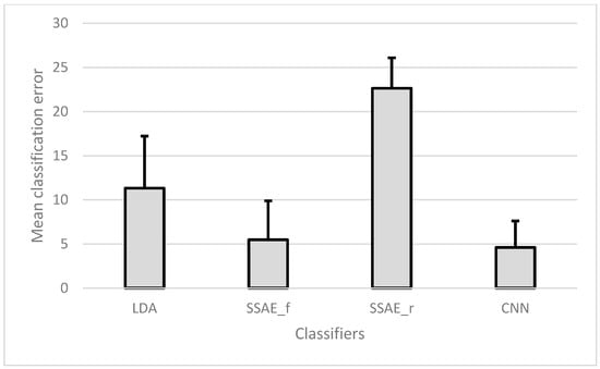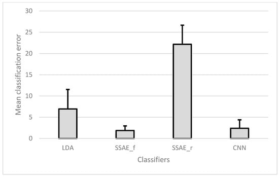 Overall, LDA, SSAE-f, SSAE-r, and CNN achieved a mean CE ± SD of 14.73 ± 6.32, 10.98 ± 5.47, 25.18 ± 3.93, and 9.79 ± 4.57, respectively. From the statistical tests, it was found that CNN outperformed (p < 0.001) all other classifiers, while SSAE-f outperformed (p < 0.001) the remaining two classifiers (LDA and SSAE-r).