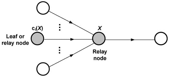The previous analysis has focused on the generation and transmission as well as the reception and forwarding of single packets. However, during a communication round, a node in a data-gathering tree is generally entailed to forward packets from multiple nodes in addition to transmitting its own packet. The scenario is described in Figure 6, where an arbitrary node X receives and forwards packets from all of its children. Every child is denoted by , with i varying between 1 and the total number of children, namely . Let also denote the total number of descendants of node X (what includes its children and, recursively, the descendants of its children). Then, according to the assumption that transmissions become sufficiently randomized, in such a way that every packet managed by a node occupies a distinct duty period (recall Section 4.1), we can set up the following equation for , the total energy consumed by node X during a communication round: