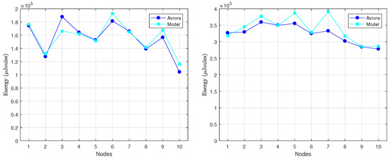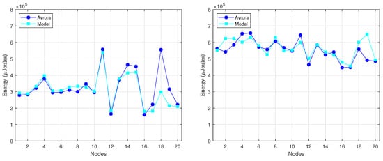 Since the reporting period is typically much larger than the LPL interval (), most of the times a radio activation does not entail any packet transmission or reception (see Figure 1 on the left). For the scenario under consideration, node A generates a packet only once every , and generally it uses several tries to send this packet to node B. In turn, node B forwards the packet to its parent node, for which it also requires a certain number of tries, completely independent of those required by node A. Specifically, we performed two experiments as part of this basic validation. In the first experiment, we varied the level of asynchrony between nodes A and B, in such a way that the number of tries required by node A also varied. According to the model described in Section 4, the number of transmissions k ranges between 1 and . For the parameter setting considered here, and hence the number of tries could vary between 1 and 61. However, in order to simplify the evaluation, we consider and, for each k, we compare the energy consumption provided by Avrora with the energy consumption calculated by our model. During the experiment, we realized that Avrora was not able to meet the exact duration of the DELAY_AFTER_RECEIVE () parameter, fixed in the source code to the value 100 ms and that, in general, its real duration tended to be slightly larger than 100 ms. For this reason, we evaluate the scenario using two different values of , namely 100 ms and 125 ms. The results are shown in Figure 7 on the left, where the energy consumed by node A to transmit a packet is represented in terms of the number of tries (k). As it could be expected, energy consumption grows linearly when k increases. We also noticed that the deviation between the results provided by Avrora and by the model was approximately 6% in the worst case (for = 125 ms), which is an acceptable value.