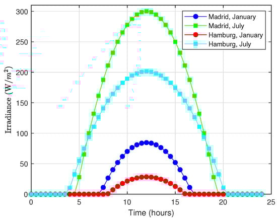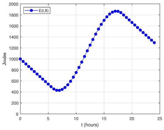 On the other hand, . Figure 16 plots the evolution of during a one-day period. Regarding the energy consumption model, we have used the data shown in Table 3, but with s and . The load has been set to 30. Regarding the energy harvesting model, we have considered kWh/m/day and h (data corresponding to Madrid in September), Joules (initial energy level), a capacity of 3000 Joules and a solar cell with cm and . As it can be noticed, exhibits an oscillating behavior while condition Equation (37a) is satisfied.