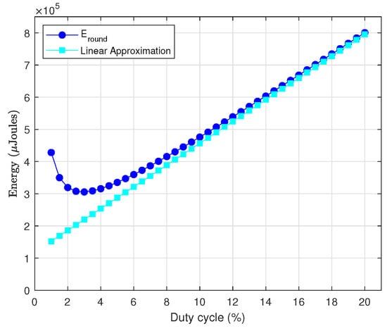 Energy consumption per round in terms of the duty cycle.