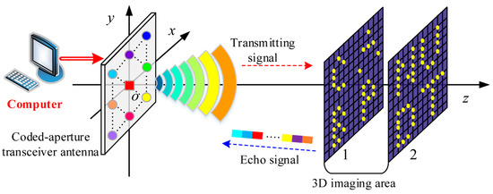 As shown in Figure 3, the BP-TCAI is mainly composed of a coded-aperture transceiver antenna and a computer. Similar to Figure 1, the red and blue dashed lines denote the transmitting and receiving processes, respectively. Unlike the traditional TCAI architecture, the proposed BP-TCAI is a SIMO system, which denotes a single transmitting antennas and multiple receiving antennas. The red square in the center of the coded aperture denotes the single transmitter. The colorful circles describing the multiple receivers are located in the coded aperture in array form. Different colors mean different amplitude or phase modulation. Different from the traditional TCAI, the modulation operation is achieved in the receiving terminal with no requirements of reducing the working distance. The computer can control the single transmitter to send signal and the multiple receivers to receive the echo added with modulation. Finally, the computer processes all the echo signals for high-resolution BP-TCAI. The detailed signal propagation process of BP-TCAI is shown as below. Similar to Section 2.1, we suppose the coded aperture only modulates the signal phase rather than the amplitude.
