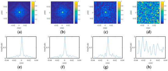 In this section, firstly, we analyze the point spread function (PSF) of BP-TCAI with different phase-modulation degrees. Essentially, the PSF is the imaging result of a point target located in the center of an imaging plane. Secondly, the range profiles under different SNRs are presented to detect the locations of the two imaging planes. Besides, to find the influence of phase modulation on the BP imaging, we present the BP projecting results without and with phase modulation, respectively. Finally, sparse Bayesian learning (SBL) [23] is used to compare the imaging results of traditional TCAI, GM-TCAI and BP-TCAI. Besides, both traditional TCAI and GM-TCAI calculate the radiating signals and echo signals according to Equations (2) and (6), respectively. Besides, BP-TCAI calculate the radiating and echo signals according to Equations (10) and (12), respectively.