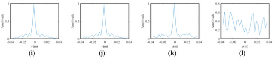 As we know, traditional BP imaging for SAR or inverse synthetic aperture imaging (ISAR) is performed without phase modulation, which is the guarantee of successful imaging for coded-aperture imaging. The BP-TCAI method can also be seen as coding-array SAR. To analyze the imaging performance of coding-array SAR, Figure 5 presents the PSF with different modulation degrees, including no modulation, [−0.25π, 0.25π], [−0.5π, 0.5π] and [−π, π] continuous phase modulations. The PSF presented in Figure 5 is simply the projection results of BP without further imaging. Figure 5a–d, e–h and i–l present the vertical view, x-axis and y-axis cross-section views of the PSFs, respectively. As shown in Figure 5a, the target point is in the center of the imaging plane. Apparently, the grid cell containing scattering information shows distinct spike pulses, which is shown in Figure 5e,i. From Figure 5b to Figure 5d, the BP imaging results become more and more randomly with the increasing phase-modulation ranges. However, when the phase-modulation range is [−π, π], the PSF image becomes blurred and is difficult to detect the target point. As for Figure 5c, firstly, the BP projecting result shows the right position of the target, which is helpful for the EV extraction of BP-TCAI. Secondly, the random condition around the target point provides enough arbitrary measurement modalities for high-resolution imaging. Therefore, to compare the imaging performance of traditional TCAI, GM-TCAI and BP-TCAI, we set the phase-modulation range as [−0.5π, 0.5π], which strike a and high resolution.