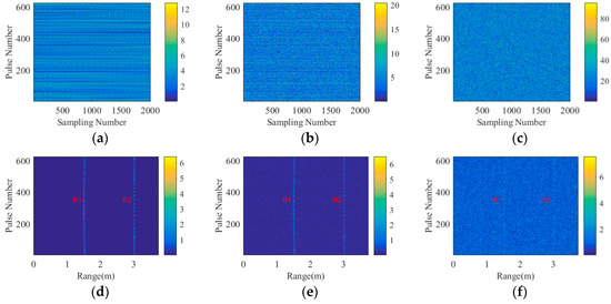 As shown in Table 1, the number of the coded-aperture array elements is 625 and the sampling times within a pulse is 2000. Therefore, the coded-aperture receives 625 pulses with the length of 2000. To obtain the range profiles of the echo signals, the 625 pulses are processed by IFT operation according to Equation (13). Figure 6a–c presents the original 625 pulses under 30 dB, 0 dB and −30 dB, respectively, while Figure 6d–f shows the corresponding range profiles. R1 and R2 are used to describe the imaging planes 1 and 2 at 1.5 m and 3 m, respectively. The echo signals become chaotic from Figure 6a–c with the decreasing SNRs. Under 30 dB and 0 dB, Figure 6d,e clearly presents the range positions of R1 and R2, separately. Although when the SNR declines to −30 dB, Figure 6f still shows two ambiguous lines at the positions of R1 and R2. Therefore, we can extract the related columns of R1 and R2 and then project them to the corresponding imaging planes by BP method, which is introduced in detail in Section 2.3.1.