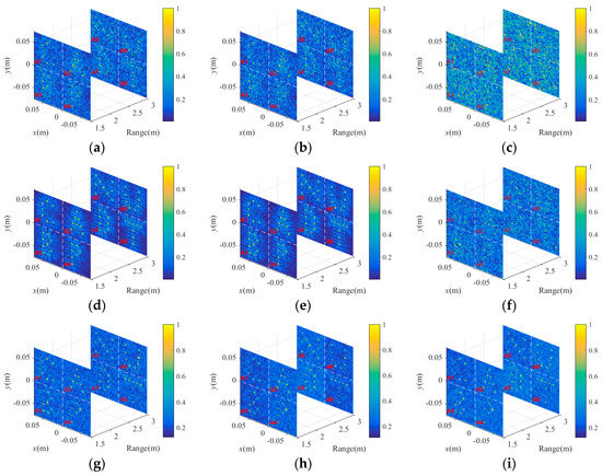 As shown in Figure 7, the projection results are divided to construct the EVs of different subareas via Equation (14). According to the extracted EVs and Equations (16)–(20), the corresponding RSMs are built for high-resolution imaging of BP-TCAI. To verify the superiority of BP-TCAI, Figure 8 compares the 3D imaging results of BP-TCAI and the previous algorithms, including traditional TCAI and GM-TCAI. The imaging models of traditional TCAI, GM-TCAI and BP-TCAI are based on Equations (5), (9) and (21), respectively. The imaging procedures of the three imaging methods are described in Table 1, Table 2 and Table 3, separately. Figure 8a–c presents the imaging results of tradition TCAI under 30 dB, 0 dB and −30 dB, respectively. Moreover, Figure 8d–f describes the imaging results of GM-TCAI, while Figure 8g–i show the imaging results of BP-TCAI under different SNRs. As shown in Figure 8a,d,g, when the SNR is 30 dB, all the three TCAI methods can reconstruct the 3D target. For 0 dB condition presented in Figure 8b,e,h, both BP-TCAI and GM-TCAI reconstruct the precise target while the traditional TCAI resolves the target with some background noise. When the SNR is greater than or equal to 0 dB, all the three imaging methods can reconstruct the 3D target regardless of the imaging performance. However, traditional TCAI resolves a cluster of disordered scattering points in the 3D imaging area under −30 dB, which is shown in Figure 8c. As for BP-TCAI and GM-TCAI, it is difficult to judge the image quality from Figure 8f,i, both of which resolve the clear 3D target. Therefore, we use RIE and PSI to compare the imaging performance of them.