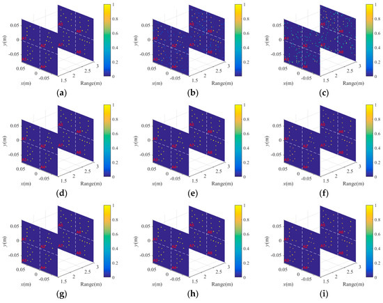 As for the computational complexity comparisons, the most time-consuming part are the reconstruction algorithms according to Equations (4), (9) and (21) for traditional TCAI, GM-TCAI and BP-TCAI, respectively. For example, SBL is adopted as the reconstruction algorithm for all the three imaging methods. Furthermore, the most time-consuming steps of SBL are matrix inversion and matrix-vector multiplication, the costs of the two operations are and , respectively. K is the number of the grid cell. As shown in Equations (4), (9) and (21), the grid-cell numbers for traditional TCAI, GM-TCAI and BP-TCAI are , and , respectively. Besides, the number of iteration for SBL can be set as M. Therefore, for the reconstruction part, the computational complexities of the three imaging methods are , and , separately. Because of the extracting processing, is much less than and . Therefore, the computational burden of BP-TCAI is reduced more significantly than traditional TCAI and GM-TCAI. Besides the reconstruction algorithm, GM-TCAI and BP-TCAI transform the received time-domain signals into range profiles and space domain according to Equations (7) and (14), separately. The transformation complexities of GM-TCAI and BP-TCAI can be calculated as and , where is the number of coded-aperture receivers. Apparently, compared with the reconstruction part, the transformation step of GM-TCAI and BP-TCAI only cost little time. From the theoretical analysis, it can be concluded that BP-TCAI consumes much less time than traditional TCAI and GM-TCAI.