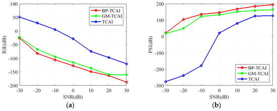 Figure 9a,b presents the RIE and PSI comparisons of traditional TCAI, GM-TCAI and BP-TCAI. As described in the third paragraph of Section 3, the smaller RIE and the larger PSI denote better imaging performance. Illustrated by the blue lines in Figure 9, the largest RIE and the least PSI under different SNRs indicate that the imaging performance of traditional TCAI is the worst among the three imaging methods. The red and green lines in Figure 9 denote the imaging evaluations of BP-TCAI and GM-TCAI, respectively. Apparently, the imaging performance of BP-TCAI is slightly better than the GM-TCAI.