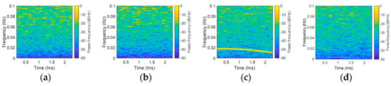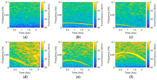 Although fast Fourier transform (FFT) is appropriate for frequency domain analysis, it obtains only the frequency components of the overall signal, which means that this method cannot handle time-frequency analysis [39,40,41]. By dividing the signal into small sequential or overlapping data frames and applying FFT to each sequential, STFT is able to analyze the spectral variation over time. In this paper, STFT was used to obtain the time-frequency analysis of the CMCD features. The x-axis represents the time component, while the vertical axis represents the frequency spectrum component. Taking Site A as an example, the corresponding results are shown in Figure 10. Due to space limitations, herein we selected three satellites from each system. The STFT results of C01, C06, C08, R04, R05, R20, G02, G05, and G06 are presented in sequence. In STFT it changed from −50~−60 dB/Hz to −10~−20 dB/Hz in the vertical axis without the influence of frequency peaks, while the color changed from blue to yellow. If there was a frequency peak, we could clearly see a yellow line in the low frequency. Results showed that different satellites had different periods of fluctuation. The STFT results of C01 were not affected by this periodic waveform, and all the other Geostationary Earth Orbit (GEO) satellites had similar results. However, C06 and C08 were affected by this kind of error. Furthermore, we could see a clear yellow line ranging from 0~0.02 Hz. In most of the GLONASS satellites, we could also see this yellow line appearing in the STFT results, which ranged from 0~0.06 Hz in this experiment. For GPS satellites, it ranged from 0~0.04 Hz here. We also found that the waveform changed differently in different satellites. In G05, the yellow line in the figure rose and fell, and then rose again, which means that the waveforms fade away and then rise again quickly; this phenomenon also appeared in several BDS satellites such as C08. In some satellites such as C06, the yellow line changed slightly from 0.0125 Hz to 0.01 Hz, while in some satellites such as R08 and G02, the yellow line changed rapidly from 0.2 Hz to 0.6 Hz. The overall frequency spectrum was also different among the different systems. As it had more yellow areas, we concluded that the GLONASS satellites experienced a higher noise level than the other two systems. Moreover, the width of the yellow line in the GLONASS system was wider, indicating that the peaks in GLONASS were wider than those in GPS and BDS systems. The difference of the overall frequency spectrums may be related to the fact that the Frequency Division Multiple Access (FDMA) strategy is used by GLONASS, while the other systems adopt the Code Division Multiple Access (CDMA) strategy. In R04 and G06, the STFT frequency spectrums in the start time and end time were different, which means that the noise frequency spectrum was also uncertain. Overall, it can be seen that the peaks width, frequency, and strength as well as the overall frequency spectrum strength varied with satellites and time. This time-varying character might be referred to some other systematic errors, which indicates great difficulty in eliminating this kind of error adaptively and effectively.