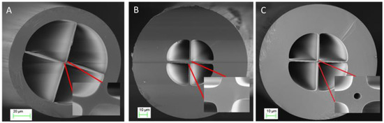 MOF-1 (A), MOF-2 (B), and MOF-3 (C) cross section. In every figure, the detail of the core geometry can be appreciated and especially in (C), the hole located in the center of the optical fiber. MOF = microstructured optical fibers.